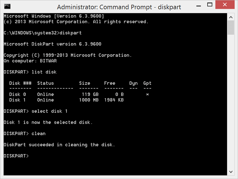 - After Showing Diskpart succeeded in cleaning the disk, make a new partition on the USB drive using “create partition primary” command.